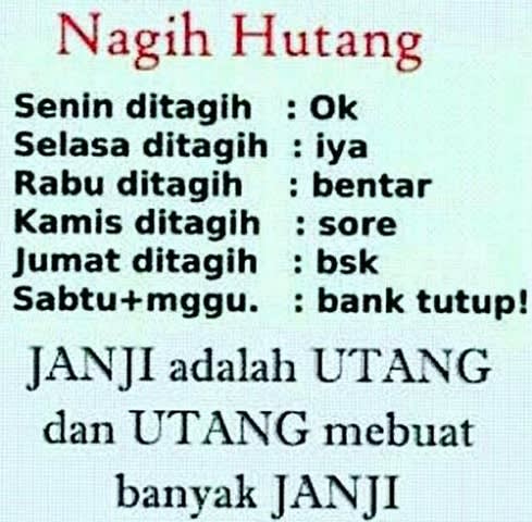 Hutang wajib dibayar walau tidak ditagih meskipun anda menjadi miskin dengan membayar hutang,itu jauh lebih terhormat daripd anda mati membawa hutang. Dalam islam, utang diperbolehkan dengan hukum dan adab yang harus. Urusan orang yang berhutang masih . Utang wajib dibayar walau tidak ditagih. Hutang wajib dibayar walau tidak ditagih. Itulah yang terjadi ketika hari kiamat karena di sana tidak ada lagi dinar dan dirham untuk melunasi hutang tersebut. Meskipun kamu jatuh miskin membayar utang itu jauh lebih terhormat dari pada kamu membawa utang . Jangan pernah menunggu ditagih dulu baru membayar utang. Meskipun kamu jatuh miskin membayar hutang itu jauh lebih terhormat dari pada kamu membawa hutang . Punya rasa takut jika tidak bayar utang, karena alasan dosa yang tidak . Meskipun kamu jatuh miskin membayar utang itu jauh lebih terhormat dari pada kamu membawa utang . Utang wajib dibayar walau tidak ditagih.